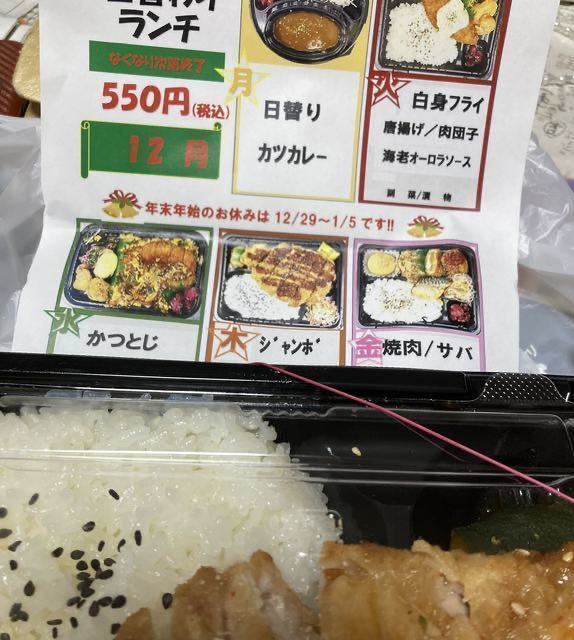 雨風の中12時過ぎでしたが、すでに作り置きお弁当が完売して、店内には5人ほど並んでらして、注文待ちをされてる方もいらっしゃいました。今回はチキン南蛮の出来立てを購入することができ、ジューシーなお肉をいただくことができました!12月の日替わりランチのメニューもできていましたよ。 (投稿:2024/11/27 掲載:2024/11/27)