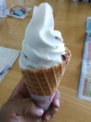 今回は、果肉入りソフトクリームが巨峰でした。お昼の1時半でしたが、ちょうど自分のところで売り切れになりました。運が良かったです。かなり早い時間に完売することに驚きました。味はソフトクリームの甘みと、巨峰の食感と甘味が非常に相性良くて美味です。あまりしつこくないのがいいですね。お得情報で「阿蘇スローフードクーポンブック」を使えば、無料でヨーグルトを1個貰えます。近くの物産館はもちろん、ここにも置いてありましたよ。