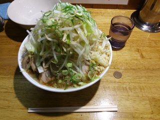 久しぶりにサイボーグ盛りを食べてきました。今は隠れメニューなので、前日までに電話して確認しないと食べることが出来ません。写真を見ていただけると分かりますが、比較の為に隣に10円玉を置きました。かなりボリュームがあります。この日は浅草開化楼の特製麺の固さがきまっていて、スープも程よい感じでした。野菜はシャキシャキで、スープと合います。チャーシューもゴロッとホロホロで旨い。ここまで盛ってあると食べにくいので、写真の左上に写っている取り皿を貰うことを勧めます。自分にとって量がちょうどいいので、また近々食べたいと思います。