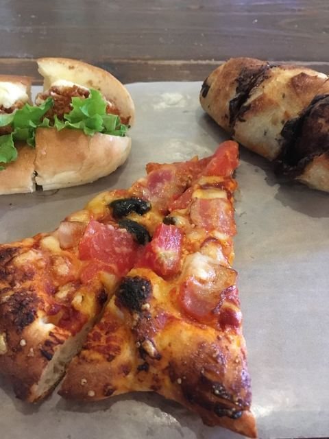 春休みだからか、お昼前なのに駐車場はお客さんの車でいっぱい!パンもいつもより少ない感じ。サンドイッチに至っては売り切れていました!でもしばらく待ってたら焼きたてピザやチョコチップがいっぱい入ったパンが焼き上がり思わず買ってしまいました。いつもイートインなのですが、こちらのお店は食べやすい大きさに切ってくださり、焼き直していただけるのでいつも焼きたての美味しさ。飲み物もほとんど有料ですがいろんな種類があります。春休み中は少し時間をずらして行った方がいいかもです。