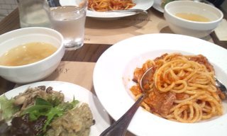 お食事のスペースが出来ているから、ランチでお邪魔しました。お店の中にあって、開放的な雰囲気の中で食べられます。サラダは、ビュッフェになっているから、色々楽しめちゃいます。茄子やトマト、サツマイモ、パン、スープ等本当に美味しいです。オリーブオイルとの相性がばっちりでした。パスタは、やわらかくて良かったです。ぺろりと食べちゃいました。