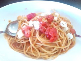 これ、噂のナガミネーゼです。名前どおり上品な味がします。モッツァレラチーズにトマトソースがよく合うんです。柔らかいコクがあります。カーラカーラさん、赤を基調にしたお店で、かわいくてポップな印象があります。イタリアの音楽が流れていて、イタリアを思い出して妄想にふけっていました。