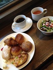 モーニングに行きました。パン食べ放題にスープとサラダ、飲み物付きで750円。1時間半の時間制限がありましたが、1時間でお腹いっぱい。パンは甘い系からピザまで10種類ほどあり、どれも美味しかった〜♪ 飲み物はブレンドコーヒーならおかわり自由。カウンター席もあるので、一人で大丈夫かと。平日も9時過ぎには多くなってました。早い時間帯がオススメです。